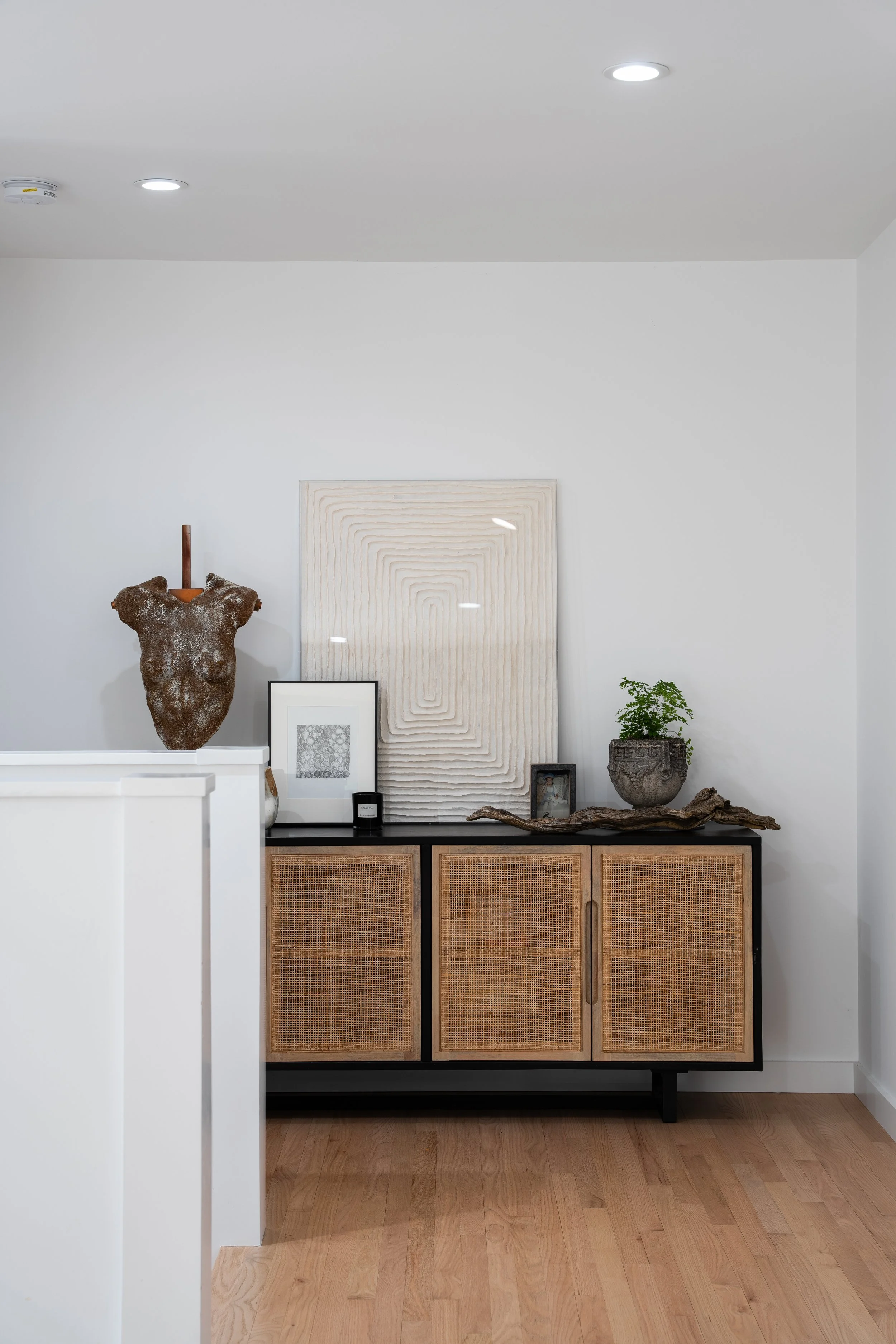 Decorative display on a black cabinet includes a stone sculpture of an abstract face, a ceramic vase with a swirl pattern, a framed black and white geometric artwork, and a small candle in a glass holder.