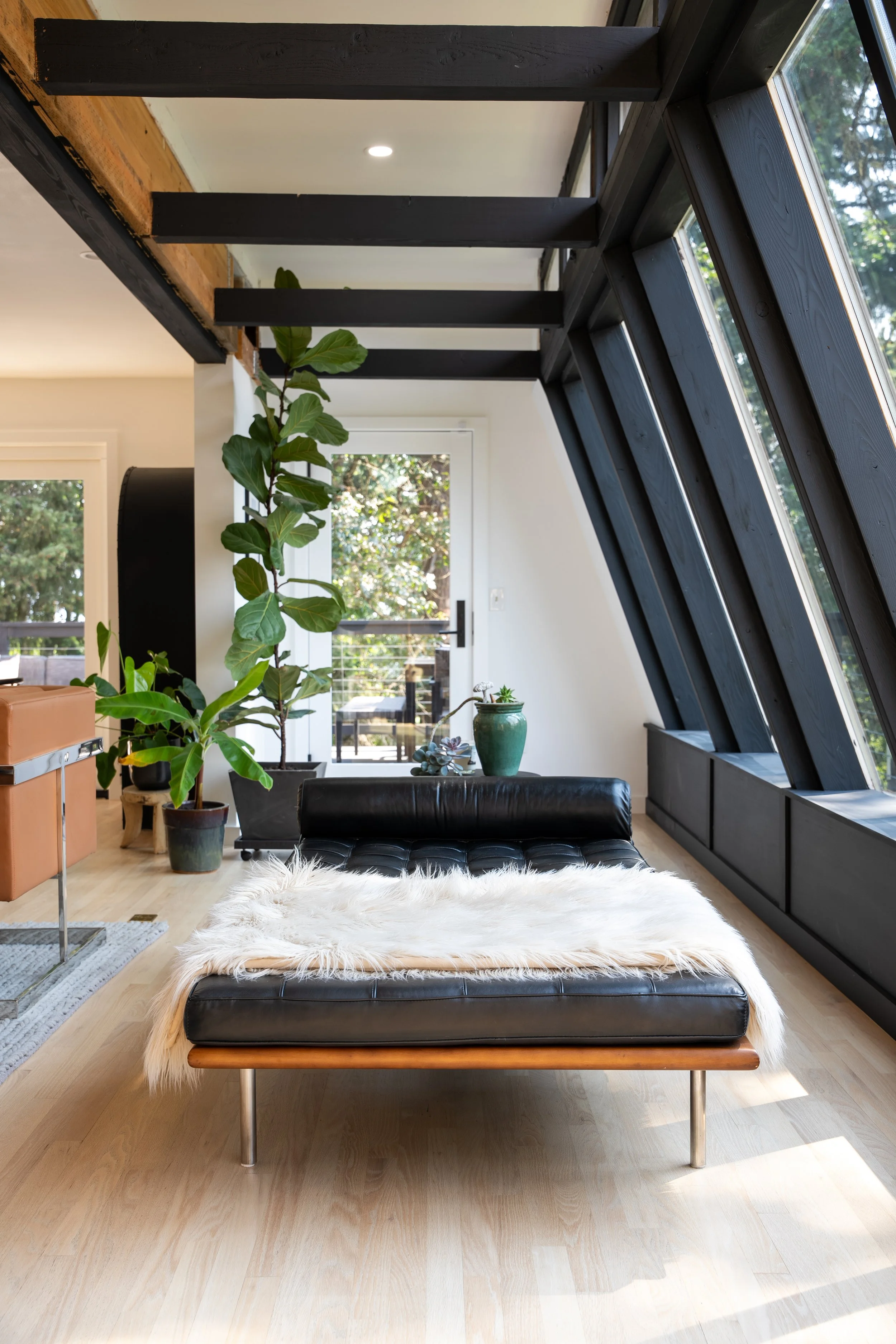 View of a black leather bench with wooden frame, a white furry throw blanket on top, and sunlight casting shadows on a wooden floor.